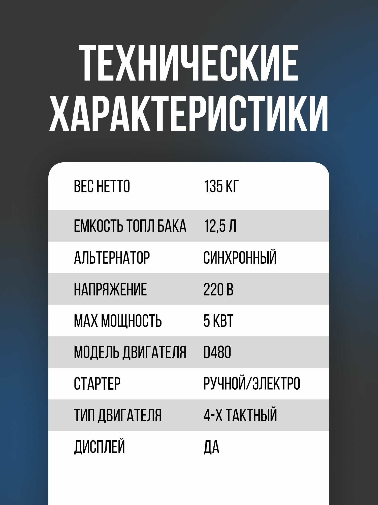 | Дополнительная информация | время работы при 50% нагрузке на полном топливном баке: 14 ч; уровень шума на расстоянии 7 м: 82 дБ; частота: 50 Гц |