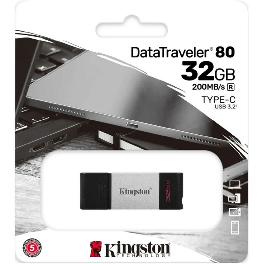Карта памяти Kingston DataTraveler 80, USB-C 3.2 G1, сереб/чер, DT80/32GB