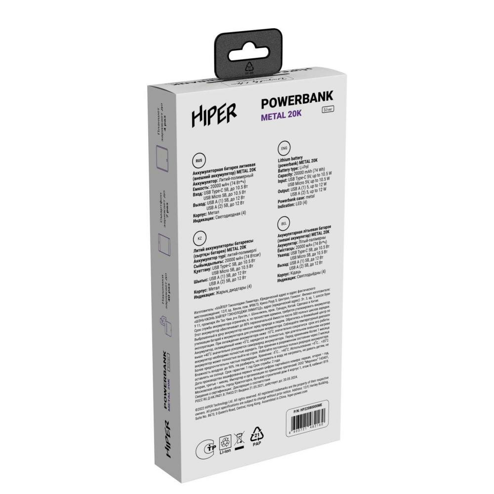 Универсальный внешний аккумулятор Hiper Metal 20K 20000 mAh, silver