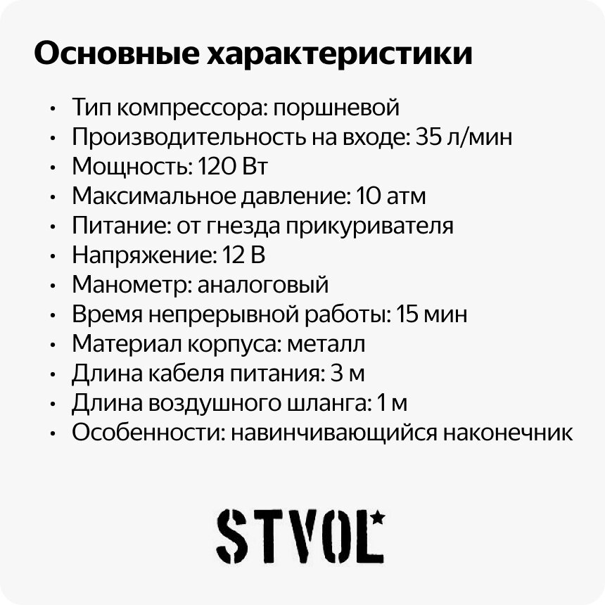 Компрессор автомобильный STVOL 35л/мин, 10А