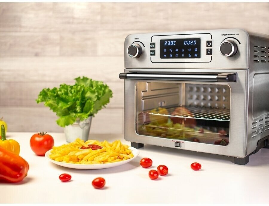 Многофункциональная мини-печь GFGRIL GFAO-700 с функцией аэрогриля, шашлычницей, вертелом для гриля и камнем для пиццы интересное: