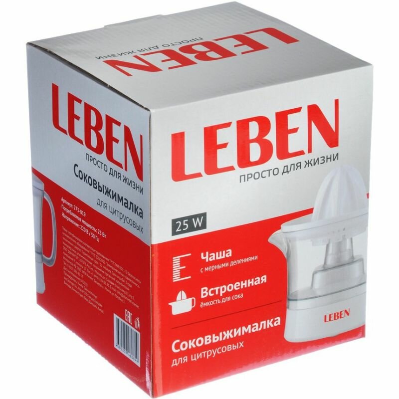 LEBEN Соковыжималка для цитрусовых, 25Вт, встроенная емкость для сока 0,5л, пластик
