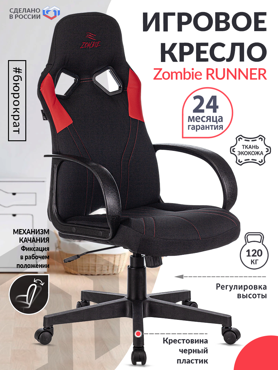 Кресло игровое компьютерное ZOMBIE RUNNER RED черный/красный, текстиль/эко.кожа, крестовина пластик