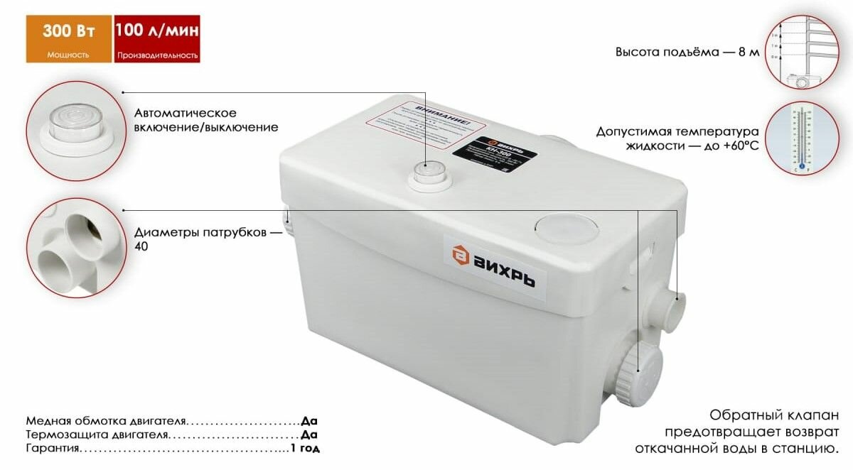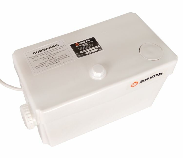 Канализационный насос Вихрь КН-300 (300 Вт, 100 л/мин, макс. напор по вертикали 8 м, по горизонтали 80м) для душа, раковины, кухни