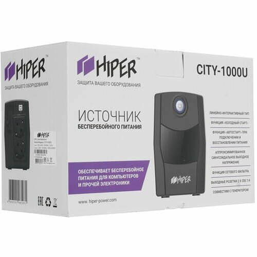 ИБП HIPER CITY-1000U {line-interactive, 1000ВА(600Вт), 2*Schuko socket, USB port, power cable, чёрный}