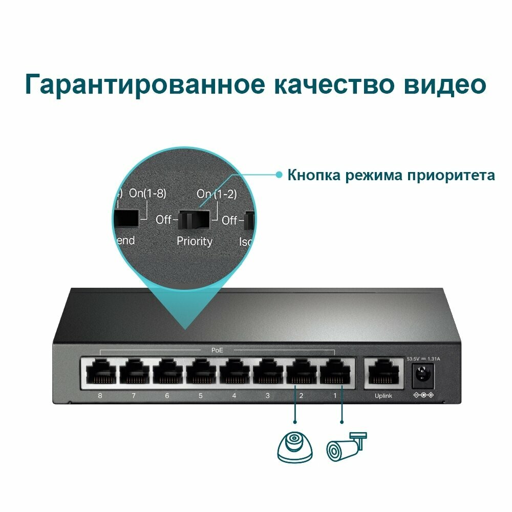 | Дополнительная информация | 8 портов PoE+, Plug and Play, дальность PoE для видеонаблюдения - до 250 м, возможность назначения высокого приоритета портам 1-2 |