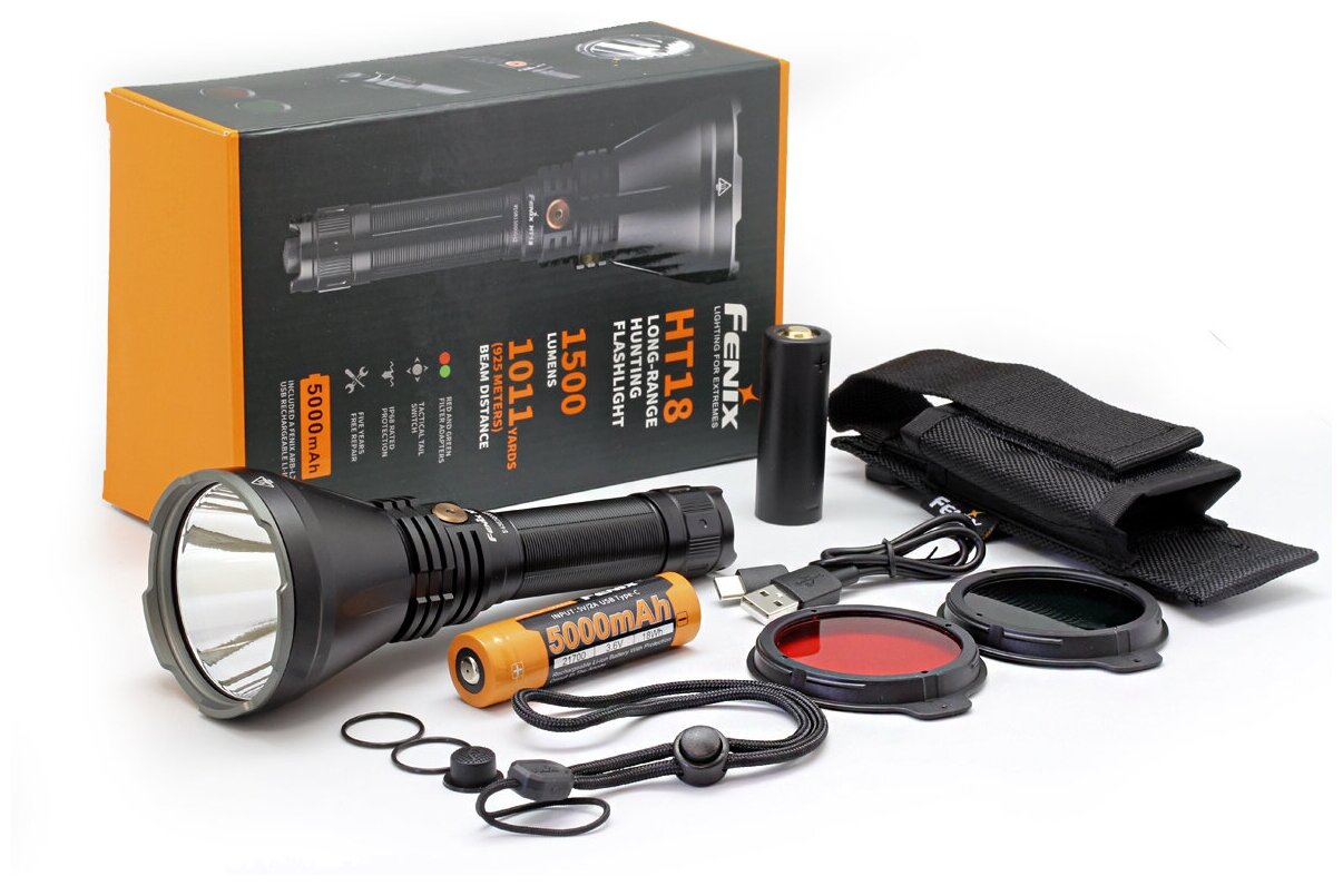 | Подробная комплектация | фонарь Fenix HT18, аккумулятор, кабель для зарядки USB TypeнетC, переходник ALFнет18, красный фильтр, зелёный фильтр, чехол с регулировкой длины, ремешок на руку, запасное уплотнительное кольцо, запасная резиновая накладка на кнопку, руководство к эксплуатации, гарантийный талон |