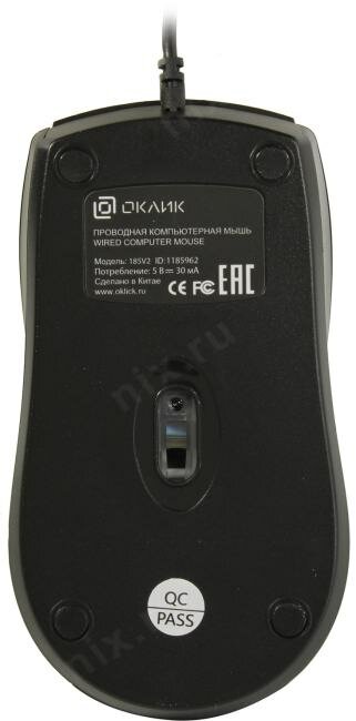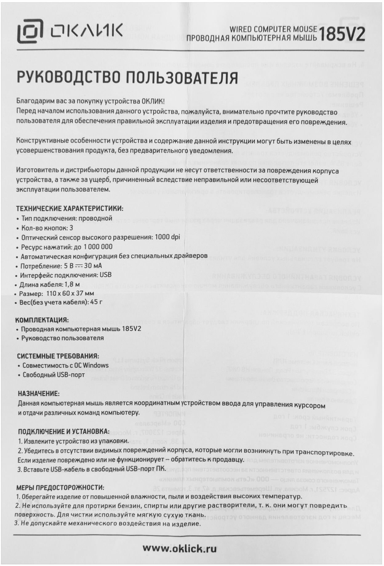 Мышь Oklick 185V2, оптическая, проводная, USB, черный [1185962]