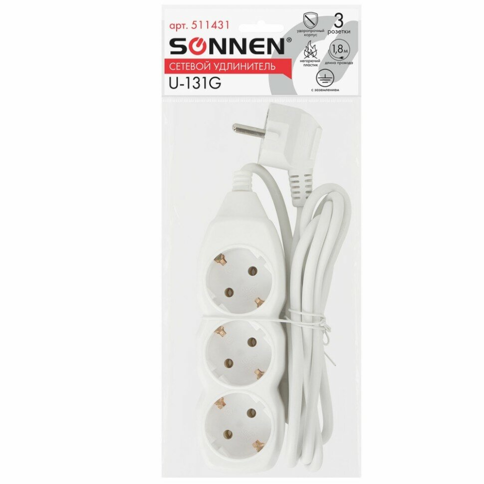 Удлинитель сетевой SONNEN U-131G, 3 розетки, c заземлением, 10 А, 1,8 м, белый, 511431 (арт. 511431)