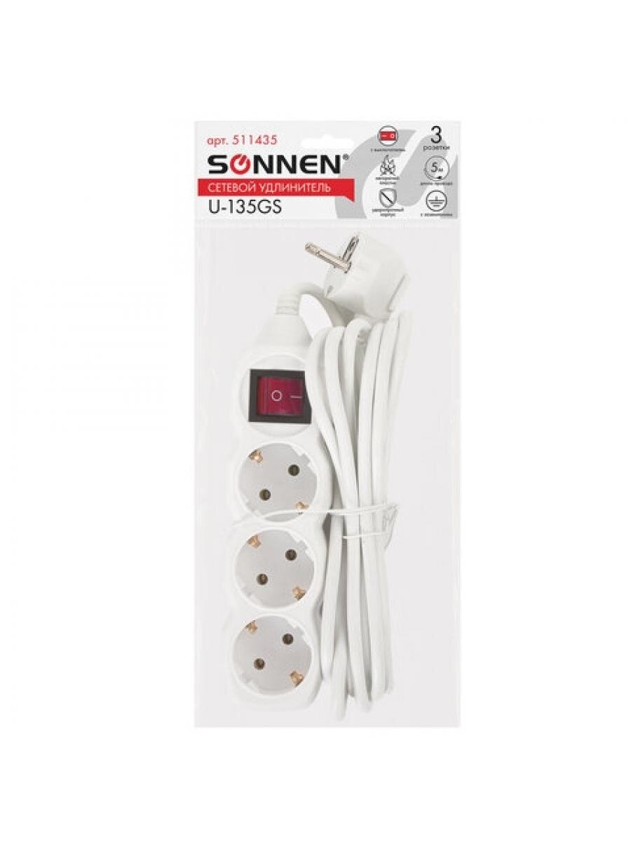 Купить Удлинитель сетевой SONNEN U-135GS, 3 розетки, c заземлением, выключатель, 10 А, 5 м, белый, 511435