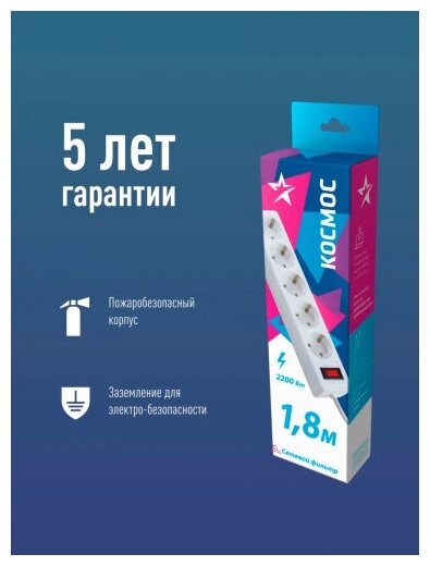 Сетевой фильтр космос FKsm1.8m-5g(W), 5 розеток, с/з, 10А / 2200 Вт белый 1.8 м 0.75 м² 5