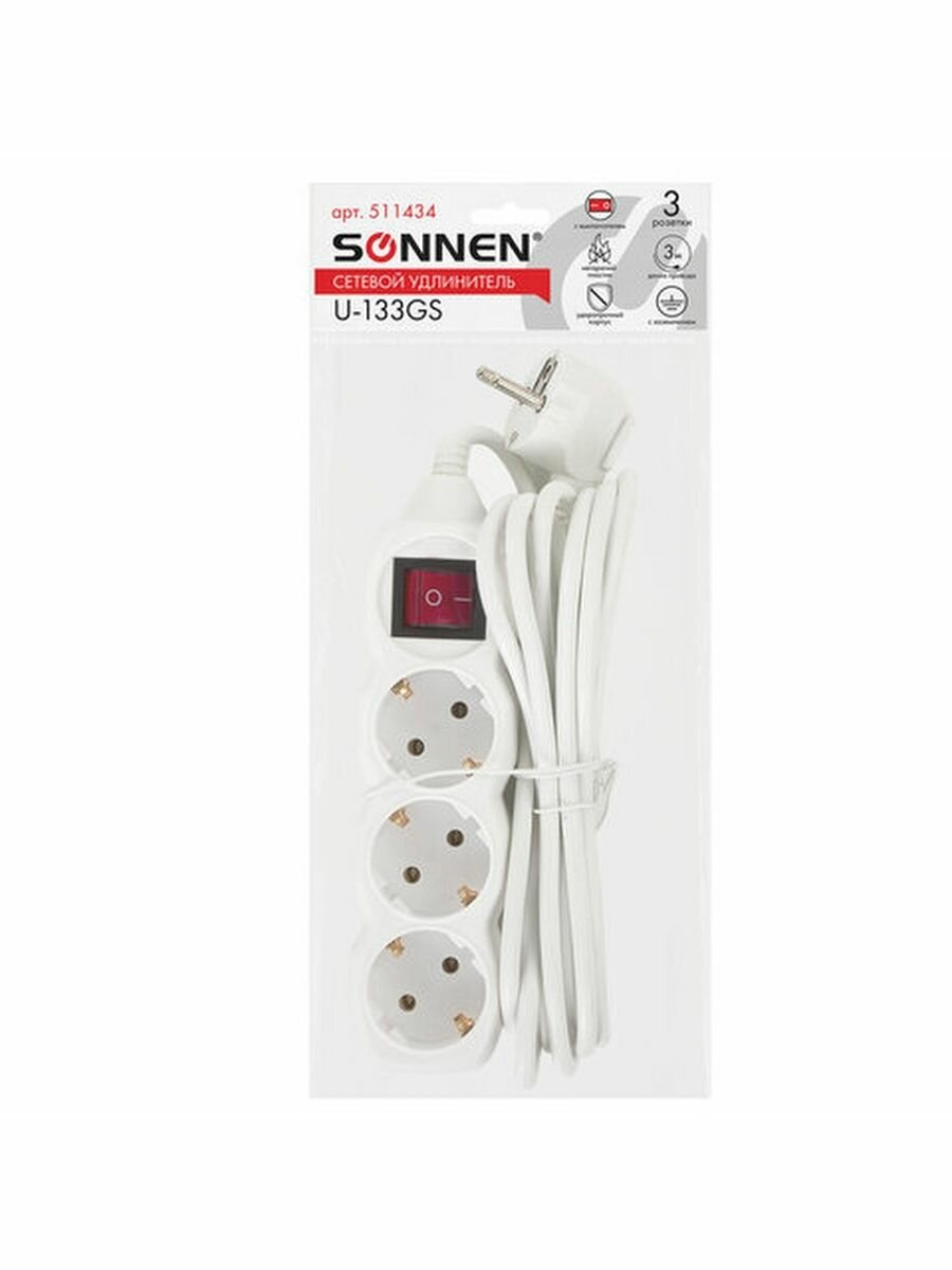 Сетевой удлинитель Sonnen U-133GS, 3 розетки, c заземлением, выключатель, 3м, белый (511434)