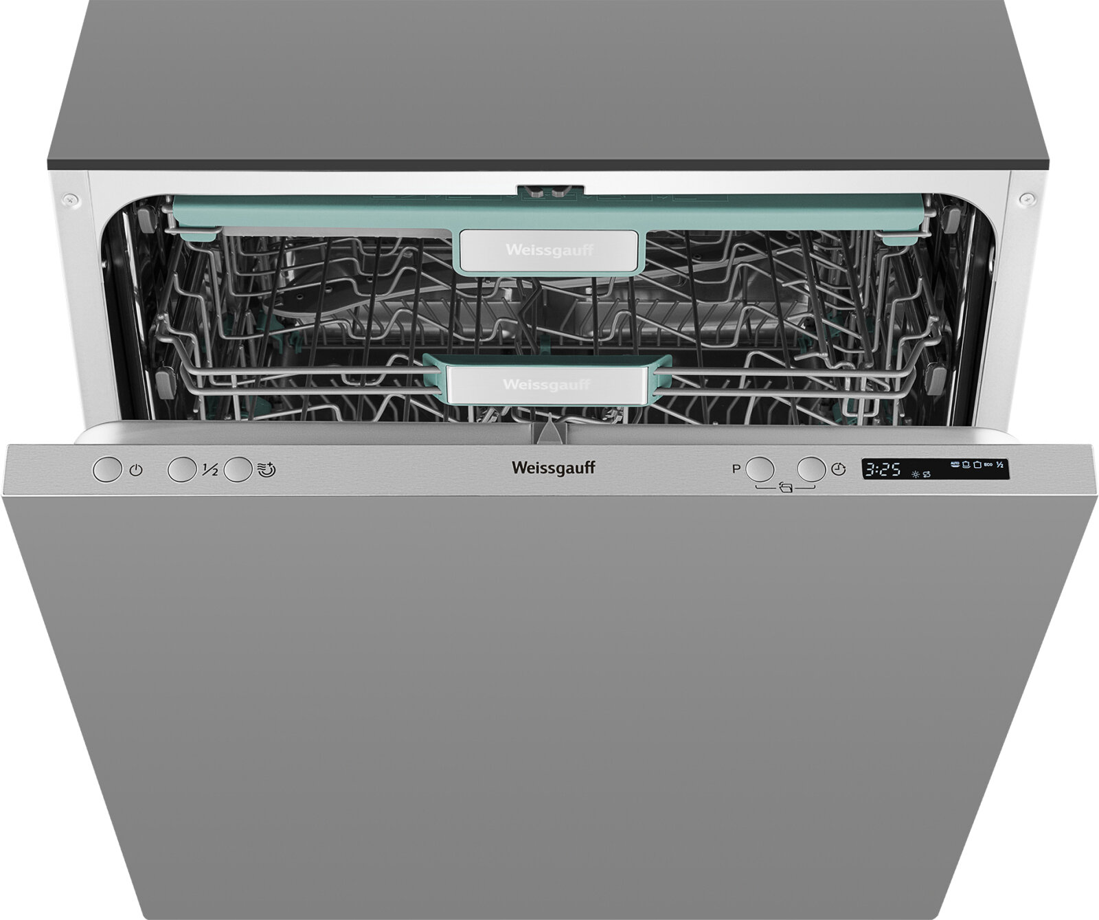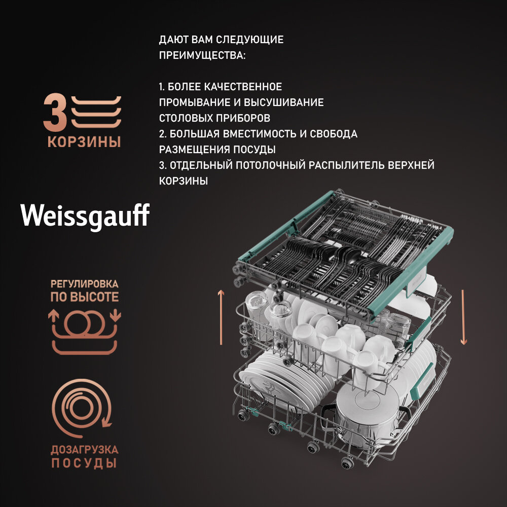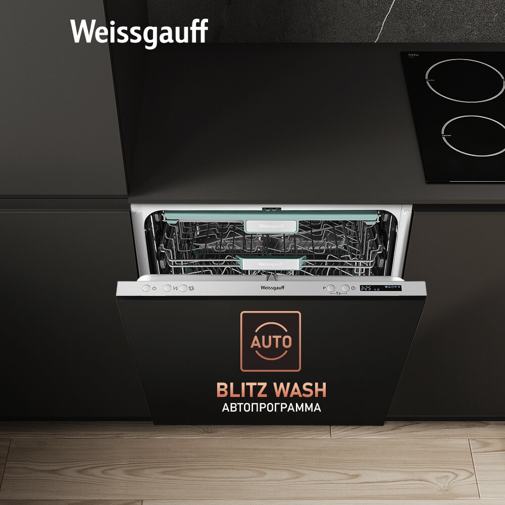 Встраиваемая посудомоечная машина c лучом на полу и авто-открыванием Weissgauff BDW 6063 D (модификация 2024 года), 3 года гарантии, 3 корзины, 14 комплектов, 7 программ, Половинная загрузка, Быстрая мойка 30 мин, Авто программа, Полная защита от протечек