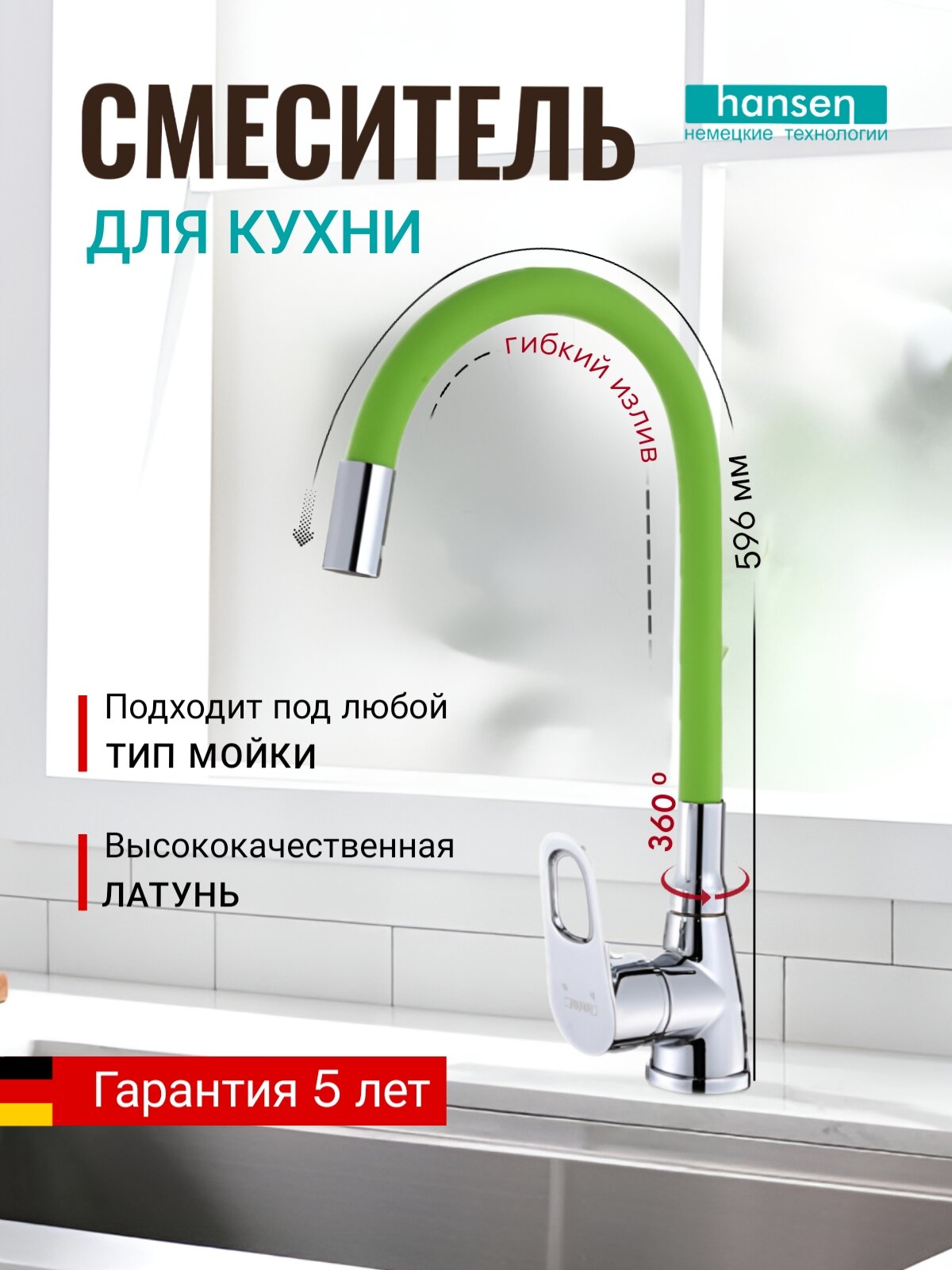 Купить Смеситель для кухни с гибким изливом HANSEN H59004Т Хром/Зеленый