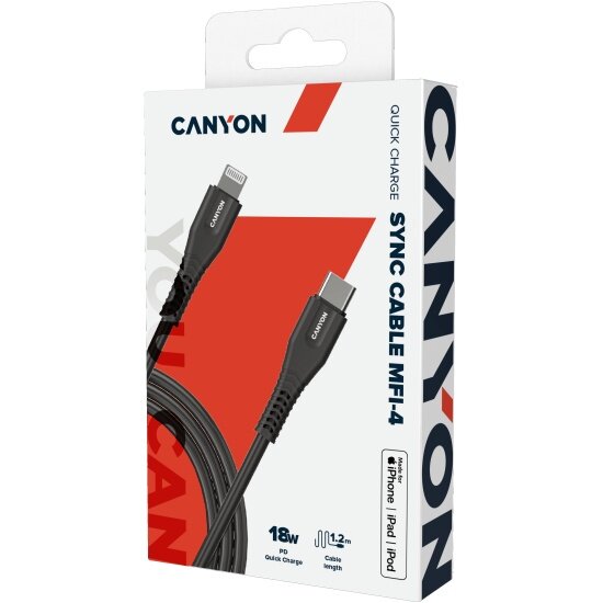 Кабель Canyon MFI-4, USB-C to Lightning, для зарядки и передачи данных, 1,2 м, MFI, Черный, CNS-MFIC4B