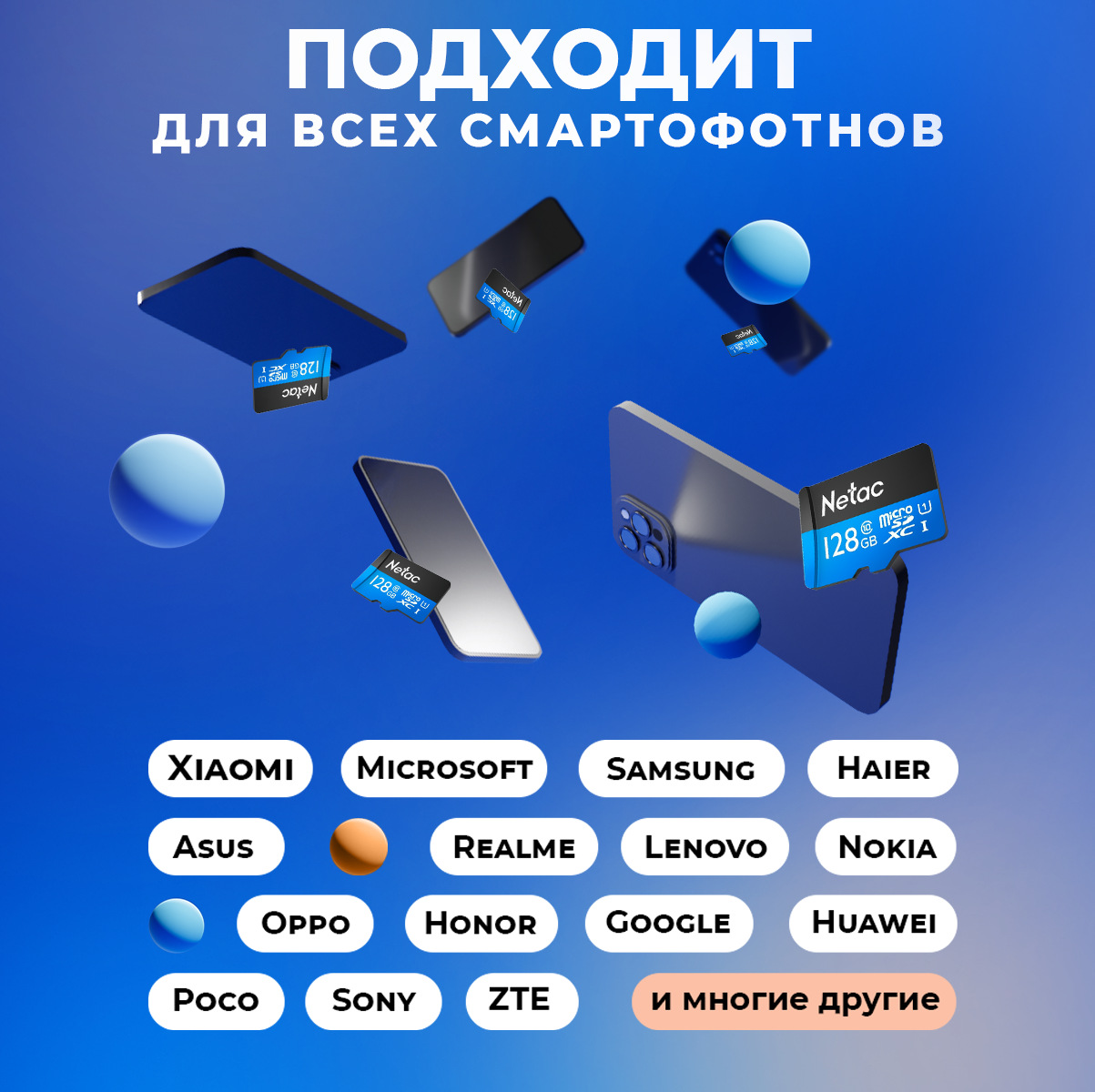 MicroSD 128 Гб Netac P500 Standard UHS-I (90 Mb/s) + SD адаптер (Class 10)
