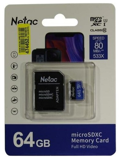 Карта памяти Netac microSD 64 ГБ Class 10, V10, A1, UHS Class 1, R 80 МБ/с, 1 шт., черный/синий