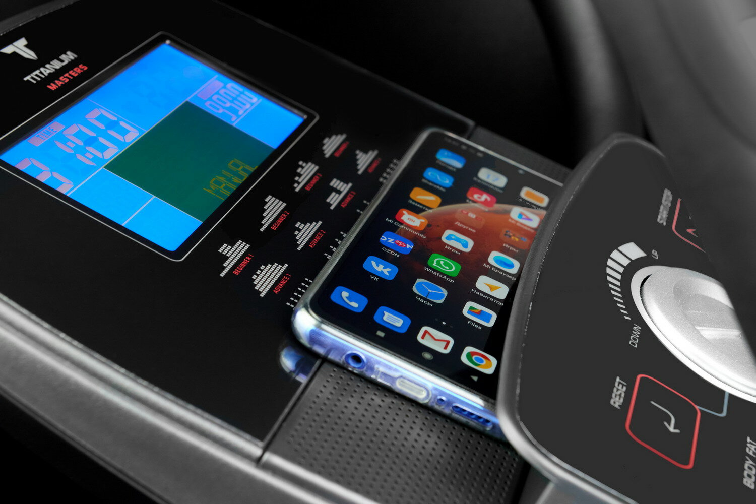 Еще очень удобная штука зарядка для телефона. Ставишь телефон на подставку, через час уходишь с заряженным телефоном. При этом телефон не закрывает дисплей, можно смотреть сериальчик и следить за показателями тренировки. |
