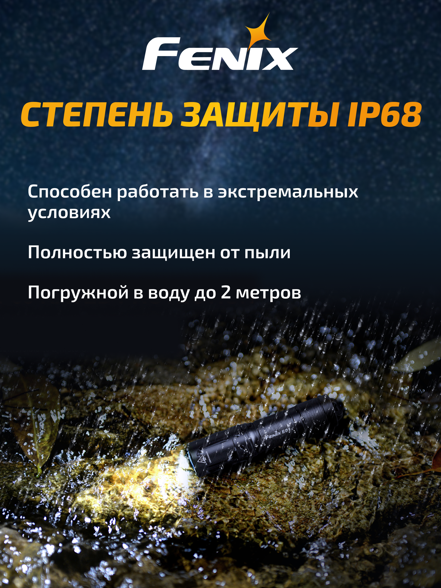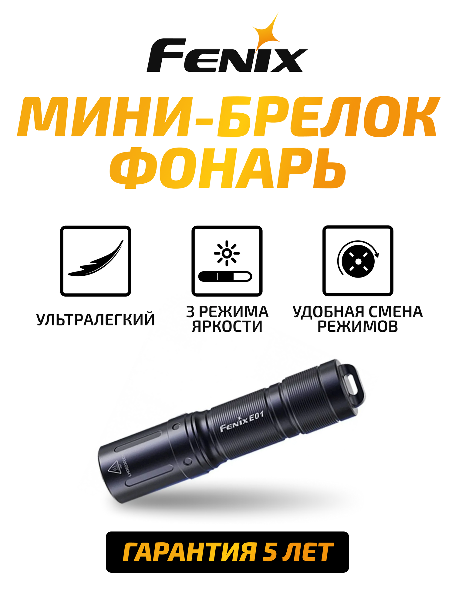 | Подробная комплектация | Фонарь Fenix E01 V2.0, батарея типа ААА, кольцо для ключей, запасное уплотнительное кольцо, руководство пользователя, талон гарантии |