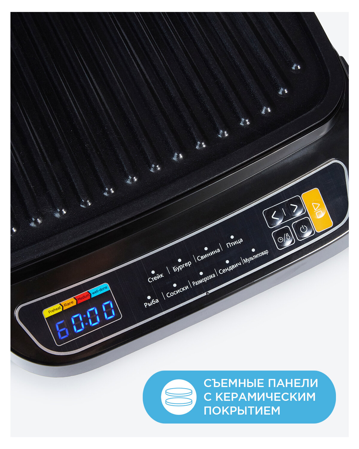 Гриль электрический Midea MGR-4500, 2100 Вт, 9 автопрограмм, автоматическое определение времени приготовления, дисплей, съемные панели, нержавеющая сталь, черный