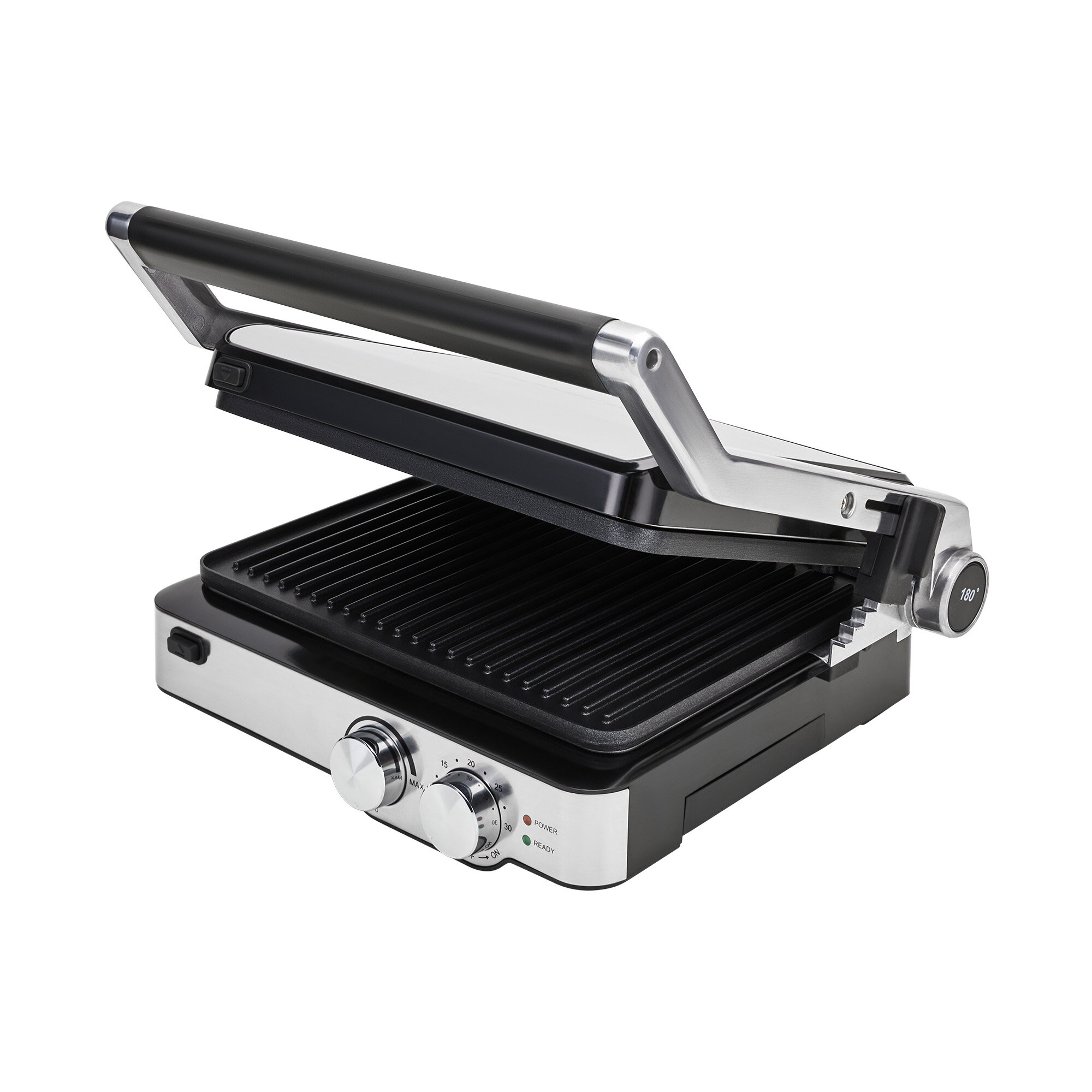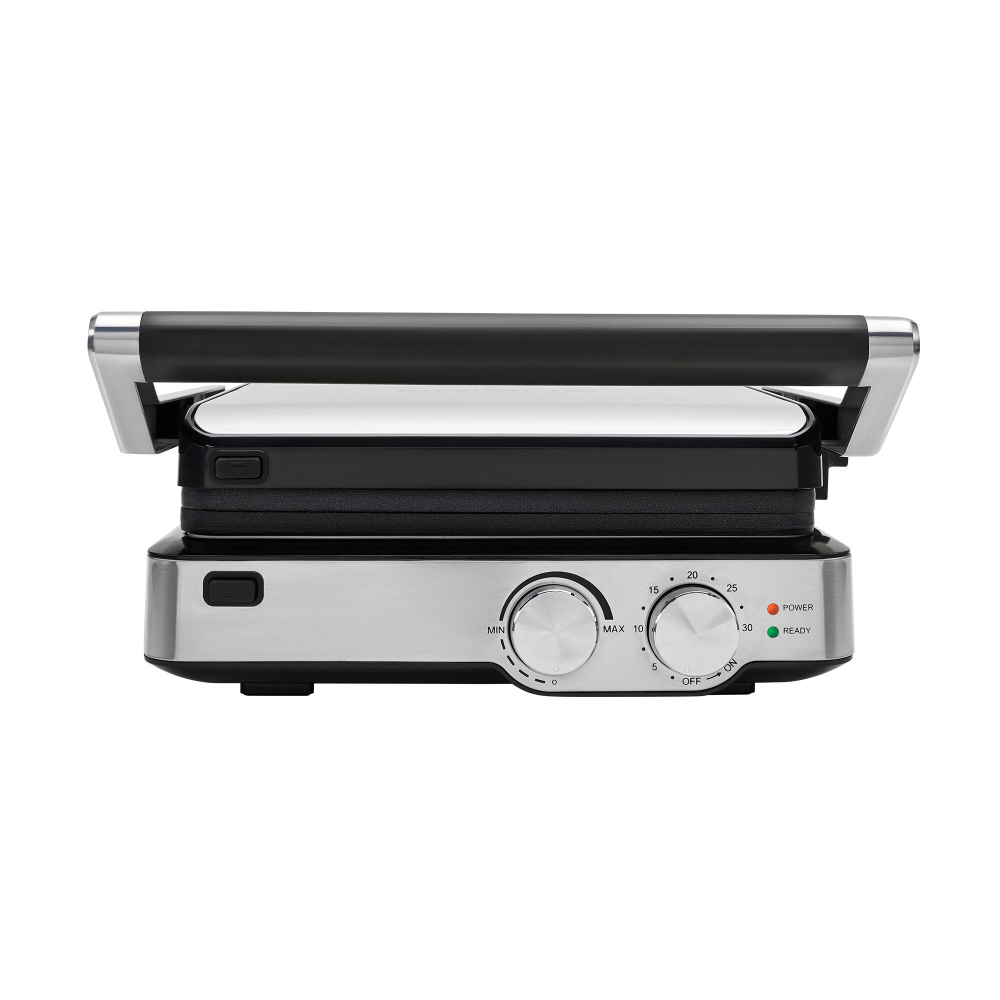 Съемные нагревательные панели: удобно мыть. Система регулирования температуры и реле времени аналоговые: нечему "гореть". Верхняя панель фксируется по высоте в трёх положениях плюс свободное: режим пресса (двустороннего контакта). Раскладывается на 180 градусов: обе панели могут использоваться одновременно как плита. |