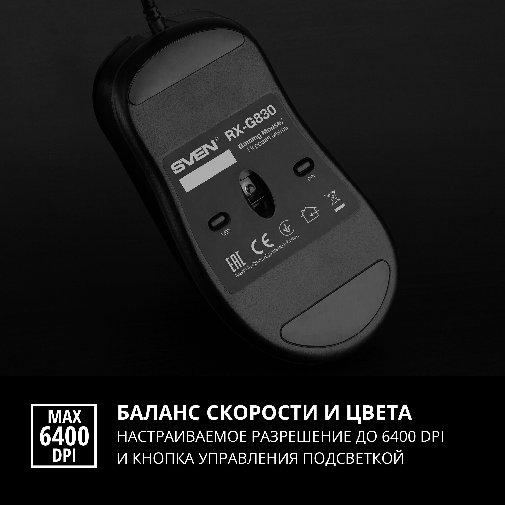 SVEN RX-G830 Игровая мышь чёрная (USB, 7 кнопок, 6400 DPI, SoftTouch, RGB подсветка)