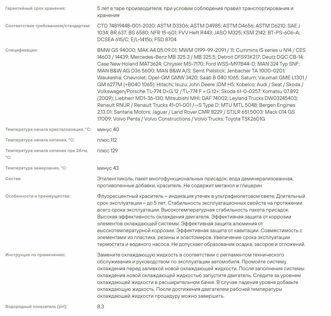 | Допуски | BMW GS 94000; MAK A4.05.09.01; MWM 0199-99-2091 / 11; CUMMINS IS SERIES U N14 / CES 14603 / 14439; MERCEDES-BENZ MB 325.3 / MB 325.5; DETROIT DFS93K217; DEUTZ DQC CB-14; CASE NEW HOLAND MAT3624; CHRYSLER MS-7170; FORD WSS-M97B44-D; MAN 324 TYP SNF; MAN B&W AG D36 5600; MAN B&W A/S; SEMT PIELSTICK; JENBACHER TA 1000-0201; WAUKESHA; CHEVROLET; OPEL-GM GMW 3420; SAAB B 040 1065; SATURN; VAUXHALL GME L1301 / GM 6277M (+B040 1065); HITACHI; ISUZU; JOHN DEERE JDM H5; KOBELCO; AUDI / SEAT / SKODA / VOLKSWAGEN/PORSCHE TL-774 D=G 12 / TL-774 F = G 12+; SKODA 61-0-0257; KOMATSU 07.892 (2009); LIEBHERR MD1-36-130; MITSUBISHI MHI; DAF 74002; LEYLAND TRUCKS DW03245403; RENAULT RNUR / RENAULT TRUCKS 41-01-001 /--S TYPE D; MTU MTL 5048; BERGEN ENGINES 2.13.01; SANTANA MOTORS; JAGUAR / LAND ROVER CMR 8229 / STJLR 651.5003; MACK 014 GS 17009; VOLVO PENTA / VOLVO CONSTRUCTIONS / VOLVO TRUCKS |
