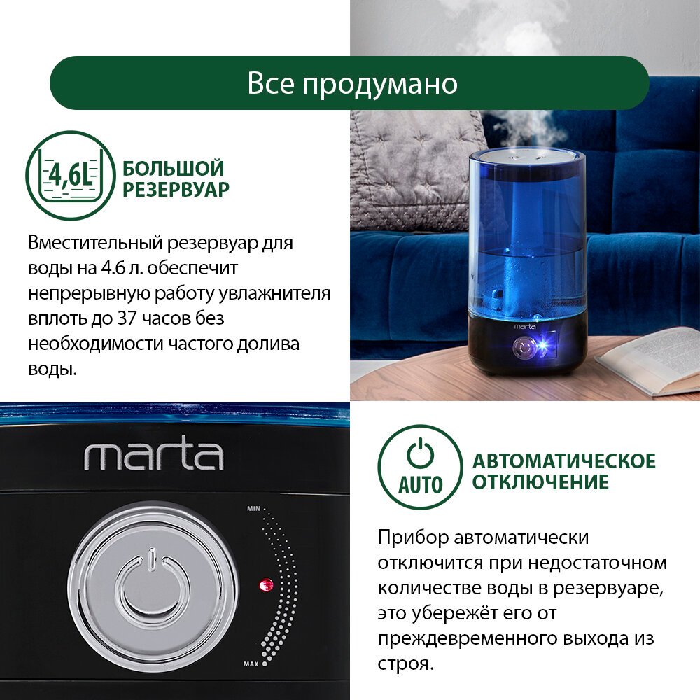 Увлажнитель воздуха Marta MT-2378 черный жемчуг 30W, ультразвуковой, верхний залив, 4,6л., механичес