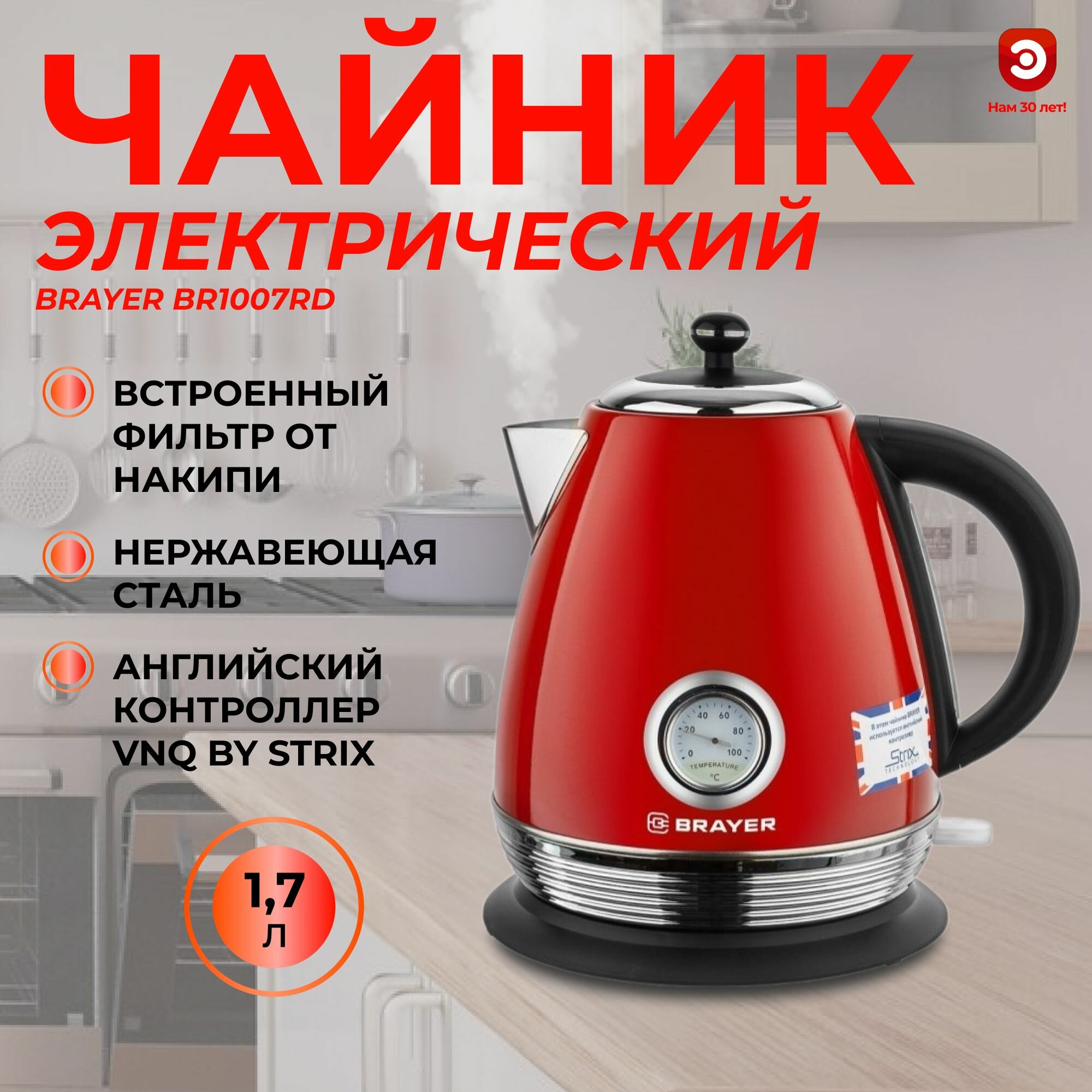 Чайник электрический BRAYER BR1007RD, 2200 Вт, 1,7 л, Strix, автоотключение, нержавеющая сталь, встроенный термометр