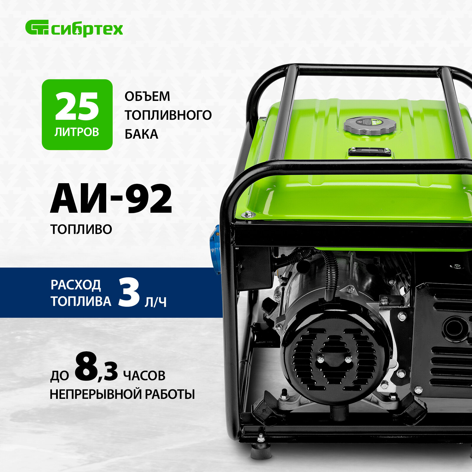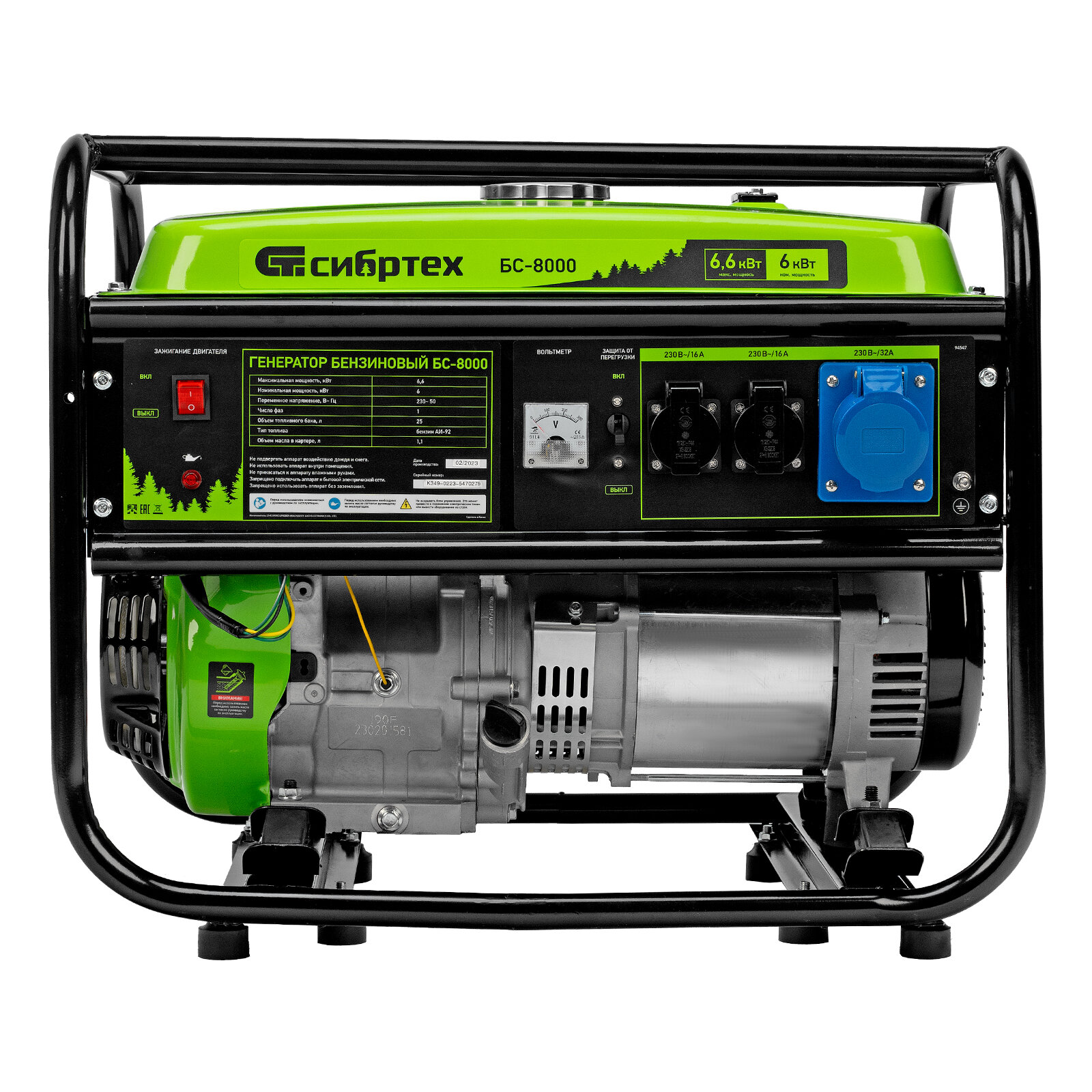 Бензиновый генератор СИБРТЕХ БС-8000, 6,6 кВт, 230В, 4-х такт., 25 л, ручной стартер 94547