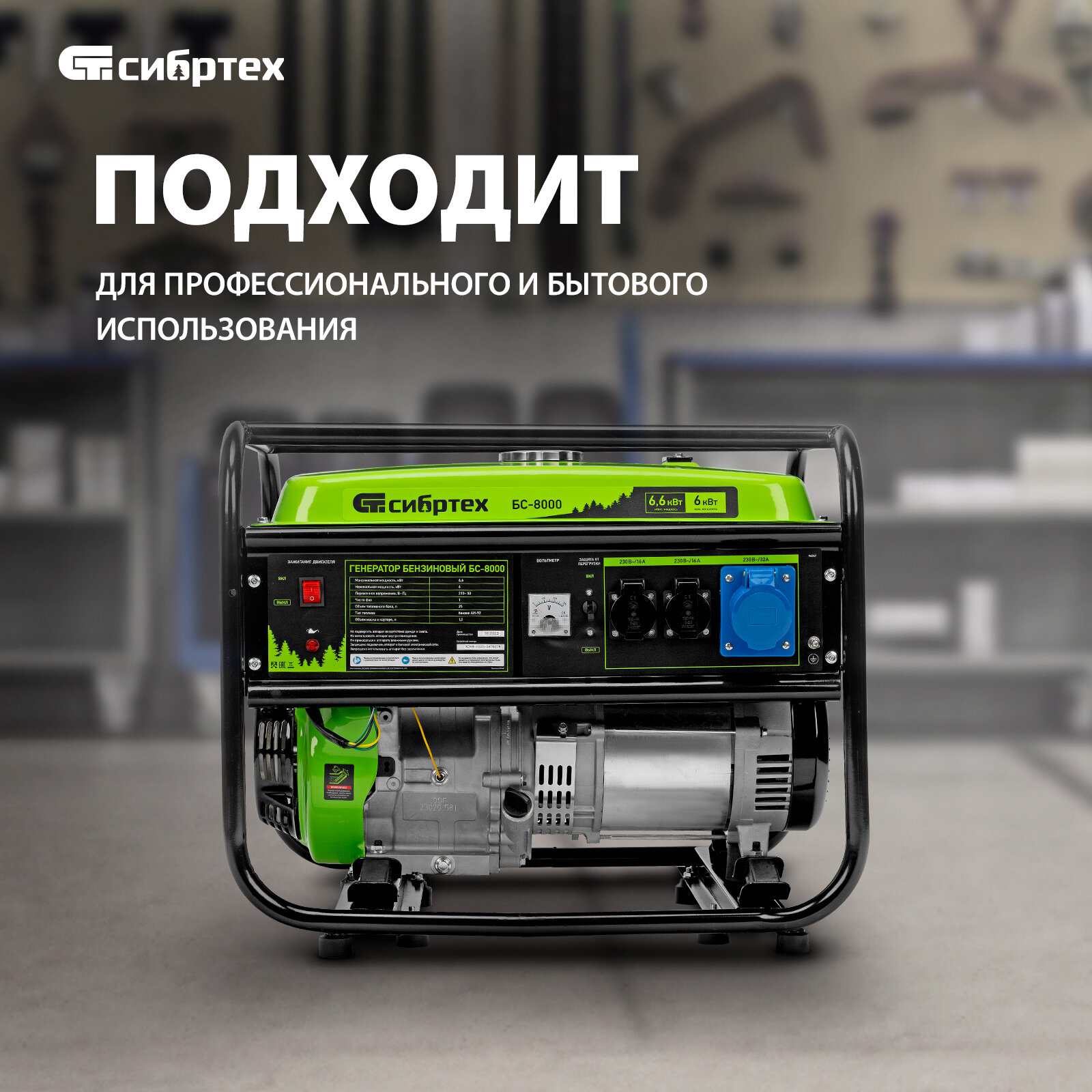 Генератор бензиновый БС-8000, 6,6 кВт, 230В, четырехтактный, 25 л, ручной стартер Сибртех