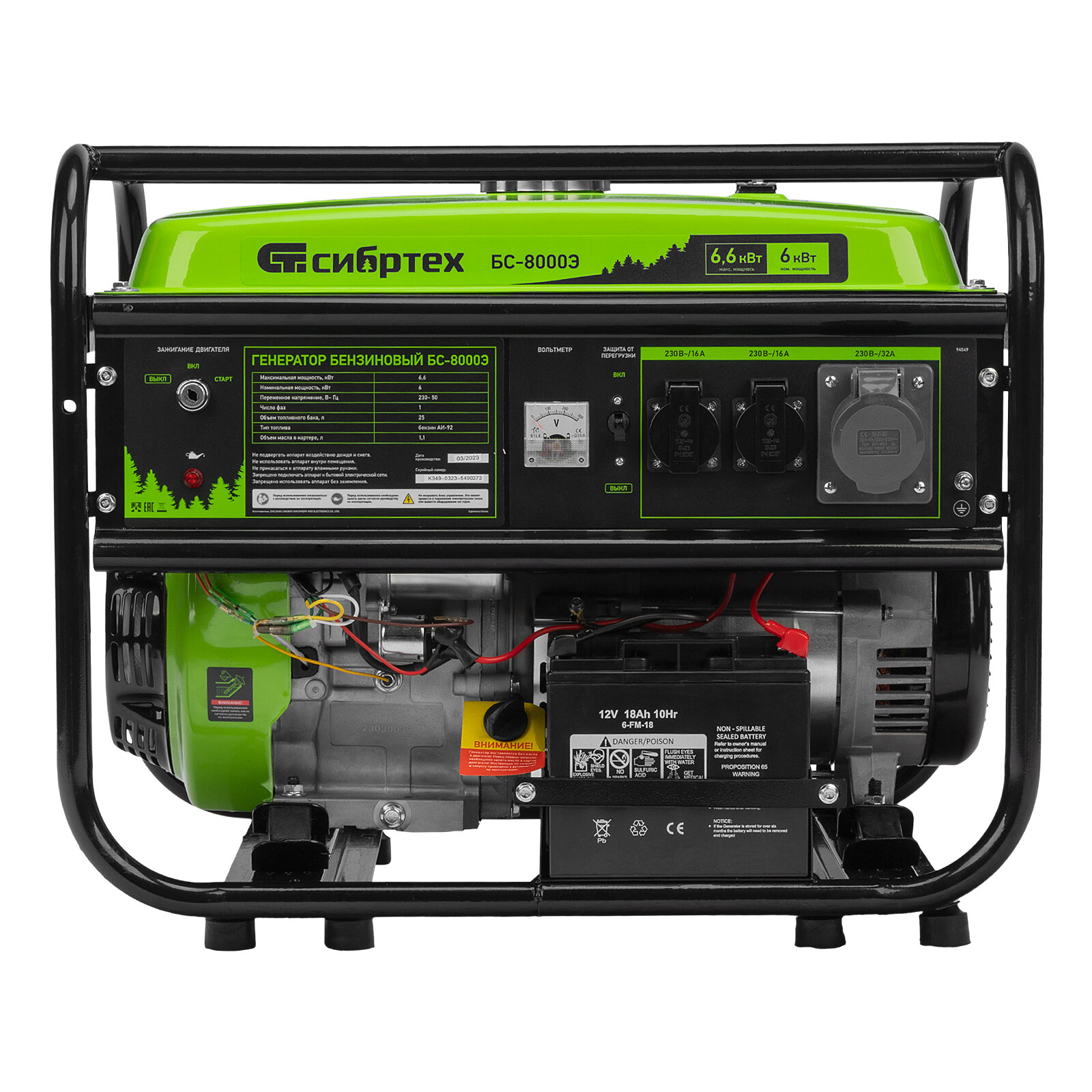 Бензиновый генератор СИБРТЕХ БС-8000Э, 220 В, 6.6кВт, с АКБ [94549]