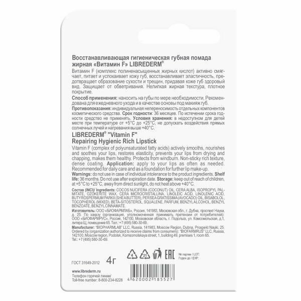 LIBREDERM витамин F Восстанавливающая гигиеническая помада для губ жирная 4 г интересное: