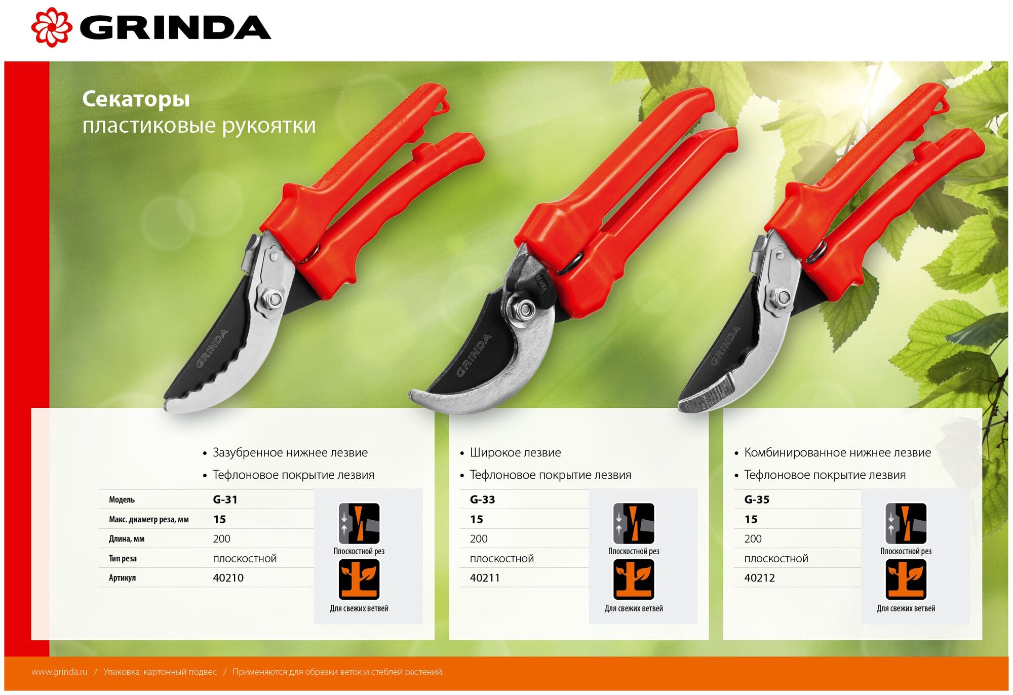 G-33 Секатор с пластиковыми рукоятками, плоскостной, 200мм, GRINDA