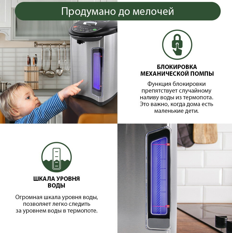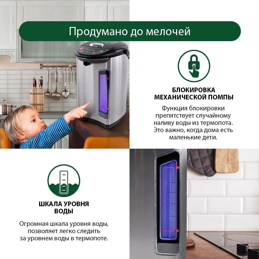 Что хочу отметить в первую очередь -- это очень безопасное устройство! Что особенно важно, если в доме маленькие дети. Крышку термопота открыть непросто и для взрослого, кнопка ручного насоса с блокиратором, обе кнопки подачи воды блокируются автоматически -- чтобы налить воду, сначала надо снять блокировку. За это отдельная пятёрка! Так что если в семье маленькие, но пронырливые детки -- берите, надёжная вещь. По шкале прекрасно видно сколько воды осталось, плюс яркая подсветка. Единственное, наружная шкала не всегда точно показывает уровень наливаемой воды до закипания и вода может начать брызгать через отверстие для пара. По внутренней отметке ориентироваться НЕЛЬЗЯ, только по внешней! Мне это неудобно. Крышка легко снимается и за это ещё одна отдельная пятёрка! Если нужно помыть, труда это не составит. Некоторые ругают за то, что долго ждать закипания, если вода и сам термопот холодные. Для меня совершенно некритично, потому что у нас его включает тот, кто встал первым, и пока умылись-переоделись, кипяток уже готов. Его много - 3 литра, так что точно хватит всем (у нас 6-8 человек обычно). Кстати, время закипания не такое уж большое, всего 20 минут. А потом можно выставить ту температуру, которую вы хотите чтобы он поддерживал -- от 45 до 98. И это ещё один огромный плюс! Бывает, что электронасос сразу после закипания не очень справляется со своей задачей, но для меня это вообще не проблема, я пользуюсь ручным обычно. Очень надеюсь, что прослужит не меньше первого. Спасибо! |