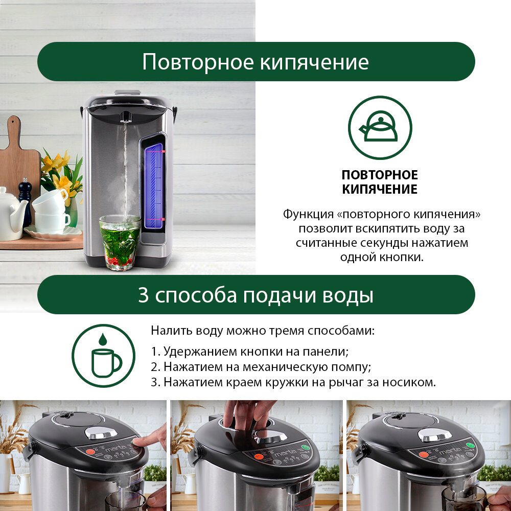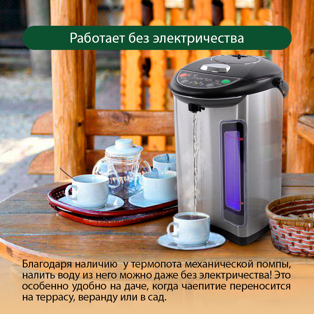 Термопот Marta MT-1999 черный жемчуг кипячение - 750 Вт, подогрев - 30 Вт, емкость 4,5Л, 304 сталь, .