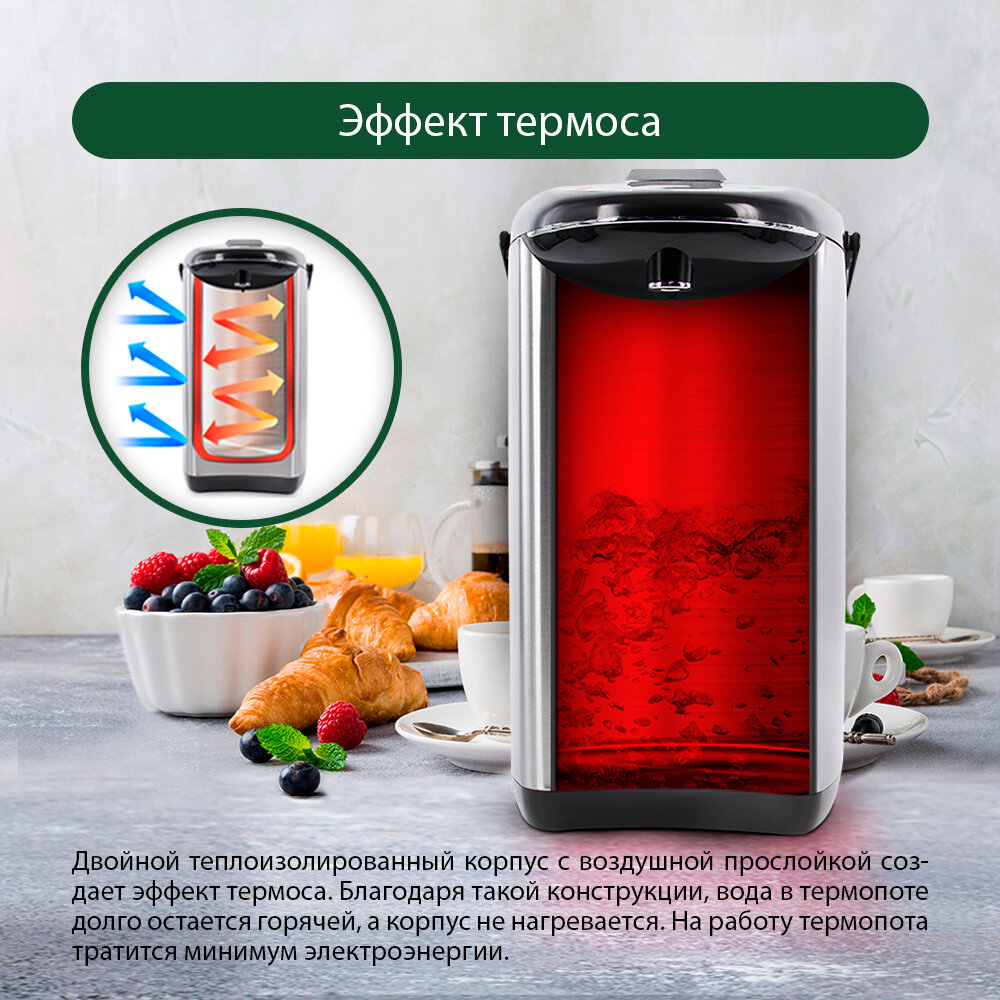 | Минусы: | Учтите, что реальный объём воды -- 3 литра! 4,5 -- это общий объем термопота. |