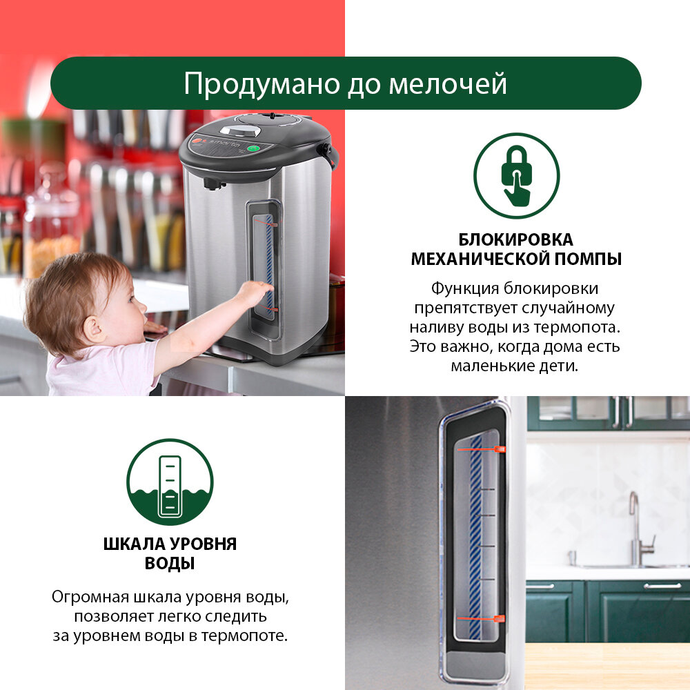 | Отзыв: | Отличный вариант для офисов и маленьких магазинов. Дома хватит и обычного чайника этой-же фирмы. Термопот на 4,5 литра, вода закипает быстро и есть функция поддержания температуры. На корпусе есть прозрачное окно, через которое видно заполнение воды, без которой он не запустится, так как есть блокировка включения без воды. Есть ручка сверху корпуса для переноски. |
