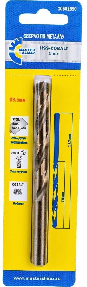 Сверло по металлу кобальтовое HSS-CO DIN-338 (8.5х75х117 мм) МастерАлмаз 10501590 интересное: