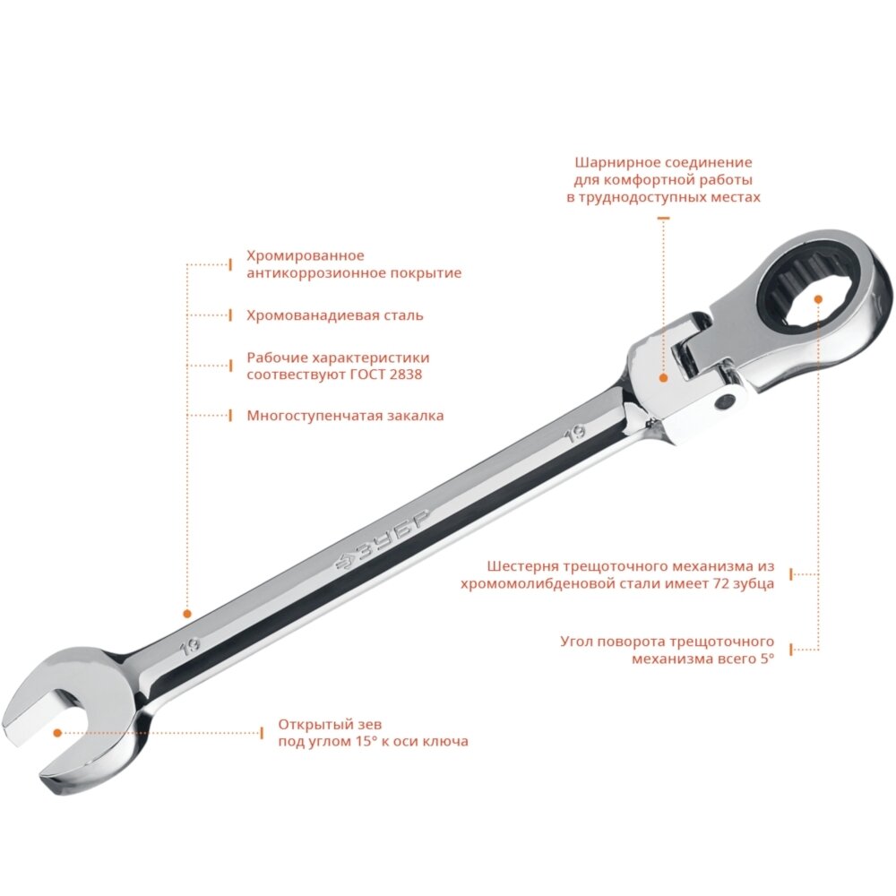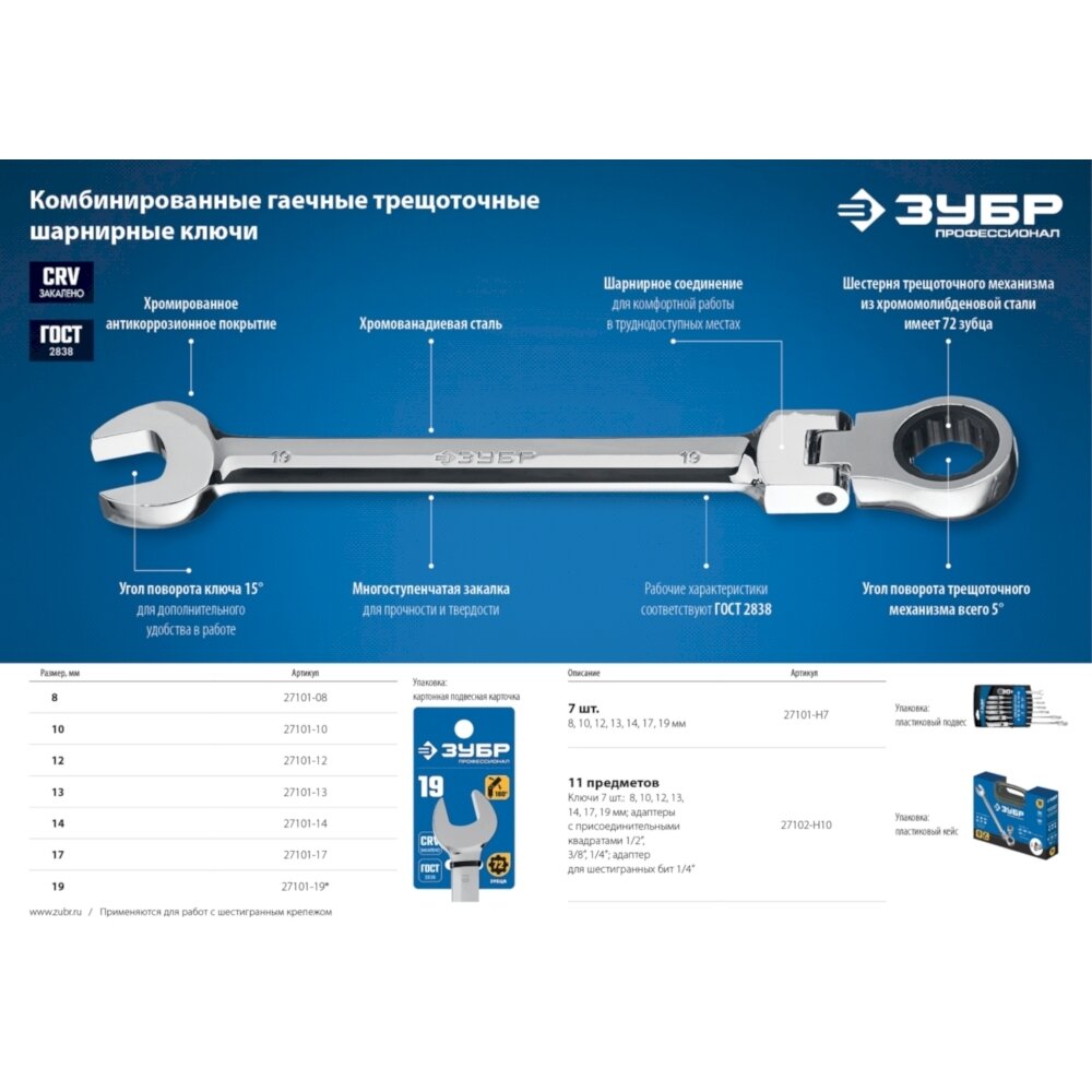 Набор комбинированных гаечных ключей трещоточных шарнирных с адаптерами, 10 шт, 8 - 19 мм, ЗУБР