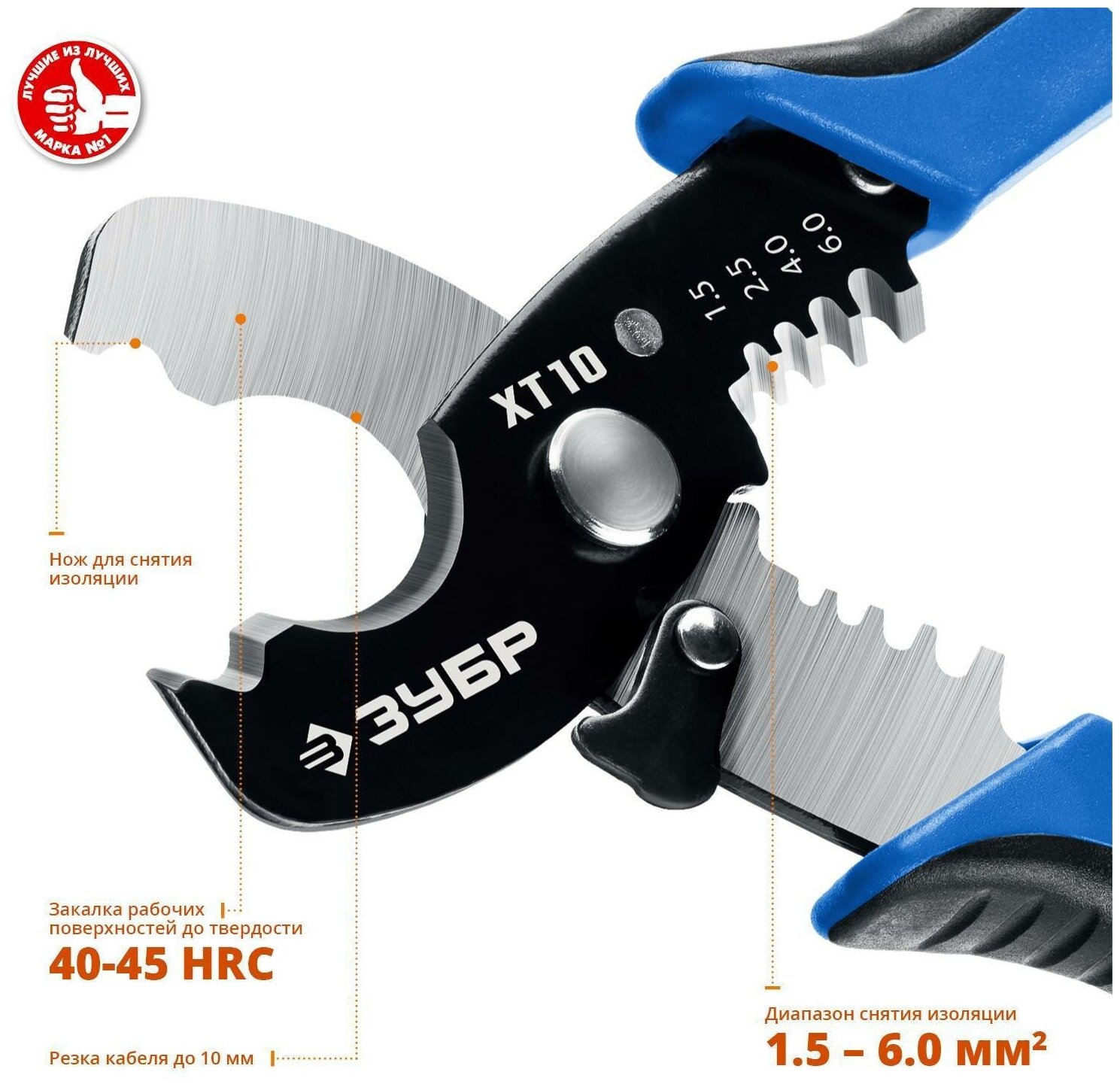 Кабелерез XT-10 со съемником изоляции, рез до 10 мм, ЗУБР 22640