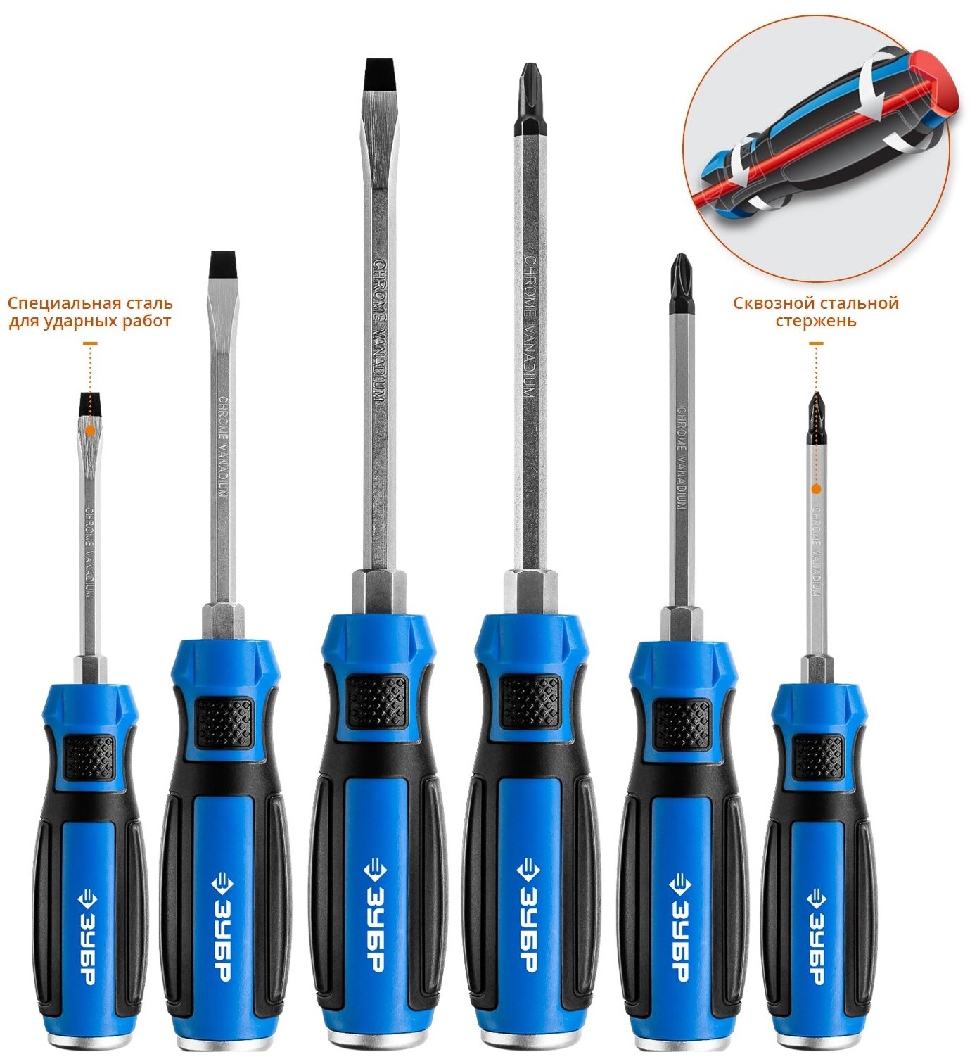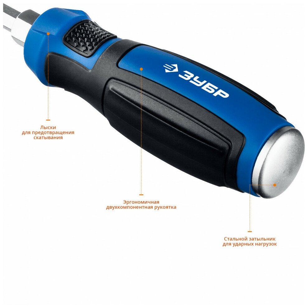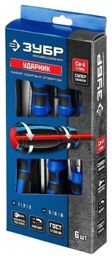 Набор: Отвертки ударные ЗУБР "профессионал" "ударник", сквозной Cr-V стержень с усилит.под ключ, 2-хкомп.рук, магн.наконечник, в коробке, 6предм 25026