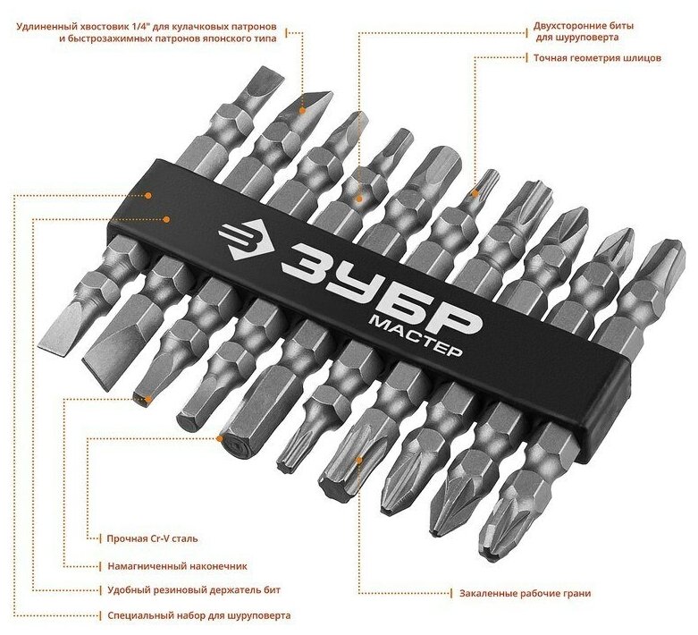 ЗУБР двусторонние для шуруповерта в держателе, набор: биты длинные "МХ-10"