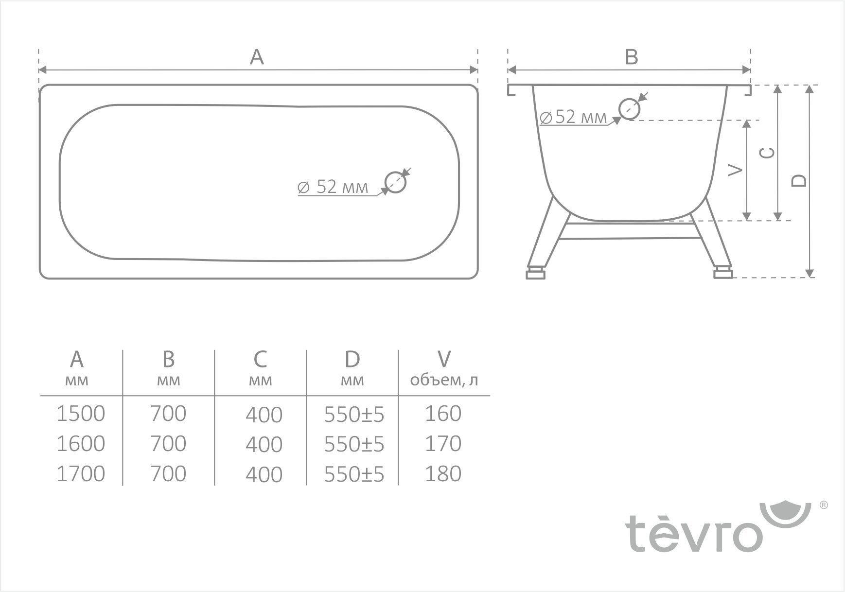 Ванна стальная TEVRO 170х70 2,7мм с ножками