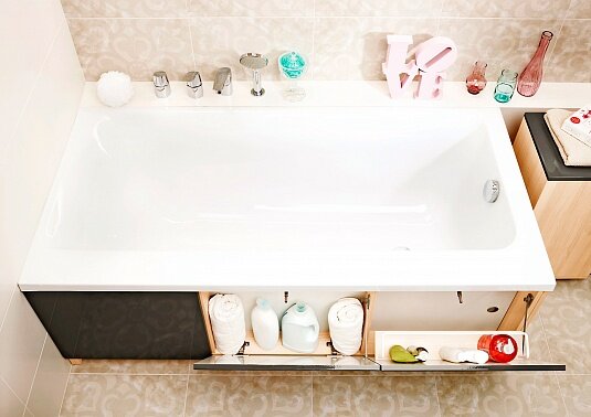 С ящиками у нас была целая история: сначала взяли с ними - не продумали, что ящикам для открывания нужно место. Пришлось сдать. Интернет магазин, приняли без проблем. На вид ящики мне очень понравились. Но когда потом стали подбирать панель под ванную, поняли, что ящики достаточно дорогие, осенью 2018 года стоили порядка 8 т.р., в итоге купили панель МДФ за 3 т.р. Все оч хор. Кстати, к самой ванной вопросов нет. Все оч хор. Пользуемся около 2-х лет. На широком краю очень удобно сидеть |