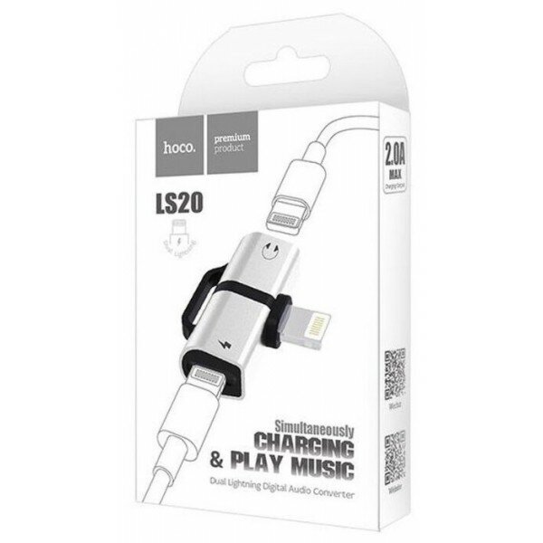 Аудио адаптер Lightning на 2 гнезда Lightning для наушников и зарядки Hoco LS20 Silver серебристый