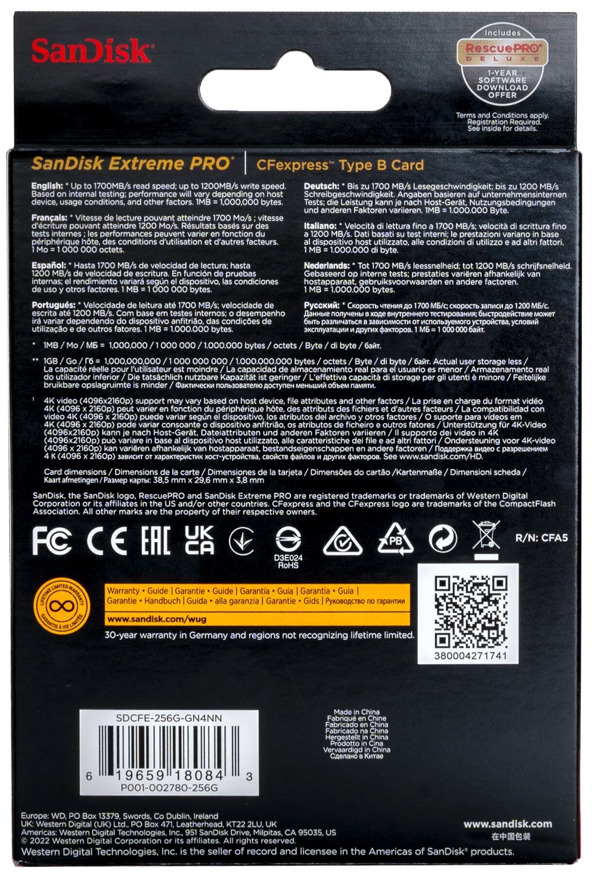 Карта памяти SanDisk CFexpress Type B 256 ГБ Class 10, R/W 1700/1200 МБ/с, 1 шт., черный