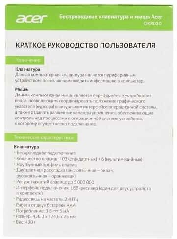 Комплект клавиатура + мышь Acer OKR030, черный, английская/русская