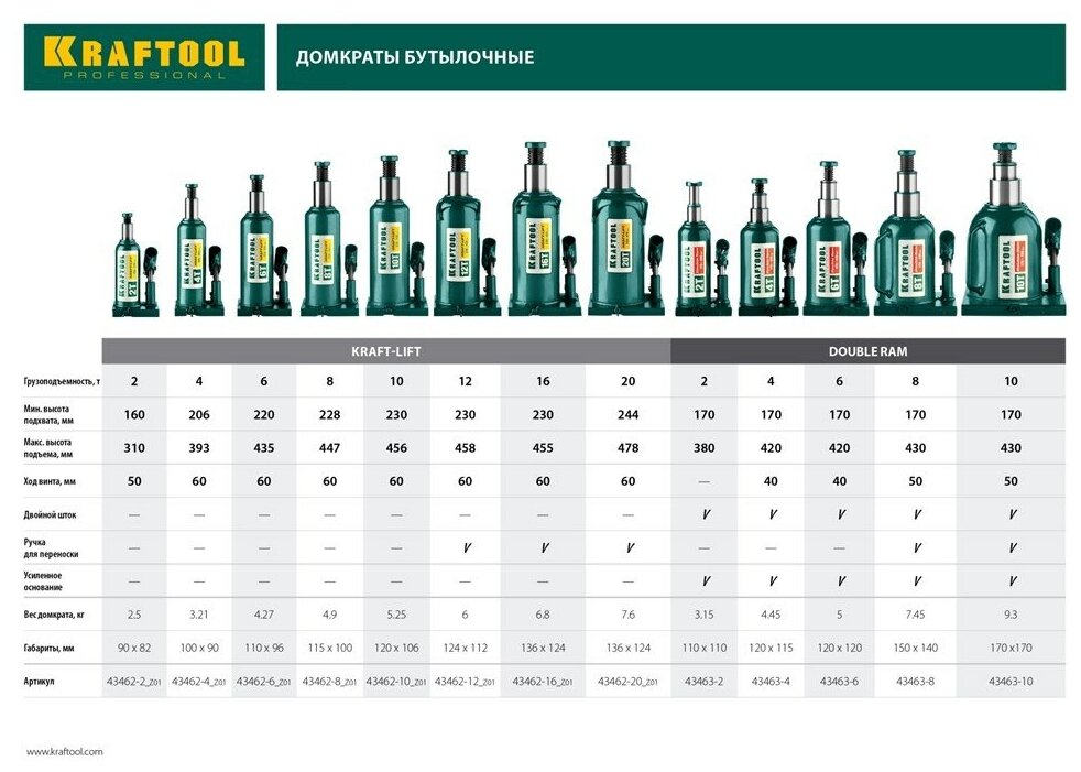 Ниже Вы можете прочитать отзывы на KRAFTOOL DOUBLE RAM 8т 170-430мм домкрат двухштоковый бутылочный с увеличенным подъемом, KRAFT BODY, ознакомится с подробными характеристиками, посмотреть интересные обзоры и фотографии на KRAFTOOL DOUBLE RAM 8т 170-430мм домкрат двухштоковый бутылочный с увеличенным подъемом, KRAFT BODY.