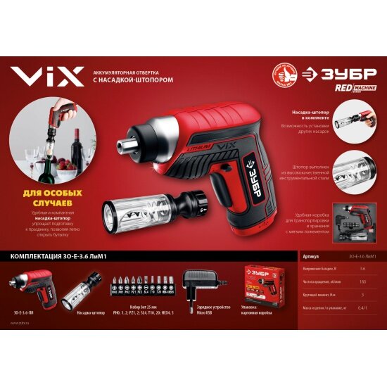 Отвертка аккумуляторная ViX со штопором ЗУБР ЗО-Е-3.6 ЛиМ1